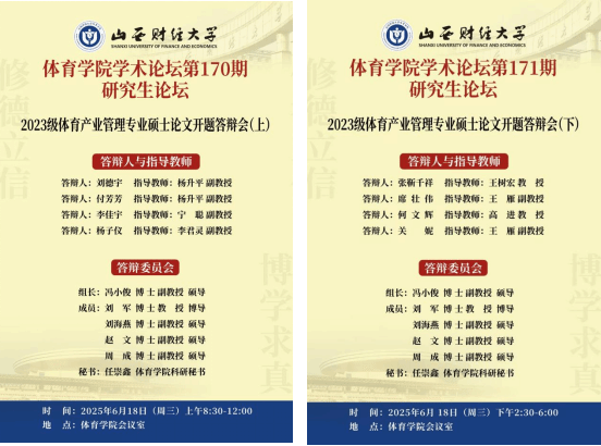 6月18日,体育学院学术论坛第170-171期研究生论坛——2023级体育产业管理专业硕士论文开题答辩会,在体育学院会议室成功举行。本次论坛聚焦研究生学位论文开题环节,旨在严把研究入口关,为后续学术探索奠定坚实基础,吸引了学院师生的广泛关注。