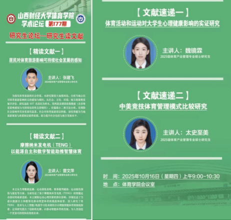 10月16日上午,体育学院学术论坛第177期——研究生读文献在体育学院会议室成功举办。本次论坛聚焦体育学科多个细分领域,四位体育产业管理专业硕士研究生带来精彩的文献研读分享,为体育学术研究与实践应用搭建了深度交流的平台。