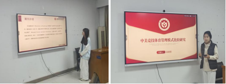 在文献速递环节,魏镜霖同学围绕《体育活动和运动对大学生心理健康影响的实证研究》展开分享。她介绍,该研究以多校大学生为样本,借问卷与数据分析探究关联。发现体育活动可通过调节神经内分泌、降低心理易感性等路径,显著缓解焦虑、抑郁,且能逆转学业等生活事件的不良影响,为高校心理干预提供实证支持;太史至美同学则围绕《中美竞技体育管理模式比较研究》进行分享,该研究对比两国体制与运行机制差异:中国以政府主导的“举国体制”为核心,集中资源高效培育人才,却存在依赖财政、机制僵化等问题;美国则是民间主导、市场化运作,依托法律规范,虽灵活多元,但易受市场波动影响。研究剖析差异成因,为优化管理提供思路。