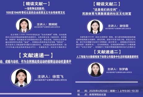 在文献速递环节,研究生徐雪飞分享了《运动、成瘾与动机:作为自然挑战类运动的极限运动动机量表开发》。该研究直面极限运动快速发展趋势,科学厘清参与者动机与成瘾行为的心理机制,为运动风险防控与户外运动产业规范化发展提供了理论支撑与实践工具。研究生张梦鑫则带来《人工智能与大数据视角下体育公共服务中生态环境满意度研究》。研究立足数智化时代,实证分析体育公共服务供给、场地生态环境与公众满意度之间的关联,挖掘AI与大数据赋能体育公共服务提质升级的现实路径,为智慧体育建设与全民健身公共服务体系优化提供了数据驱动的创新思路。