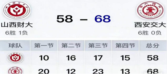 2026年3月29日,山西财经大学女子篮球队对阵西安交大女子篮球队,最终以58-68憾负对手,以6胜1负的骄人战绩斩获西北赛区亚军,为学校在该项赛事中写下浓墨重彩的一笔。